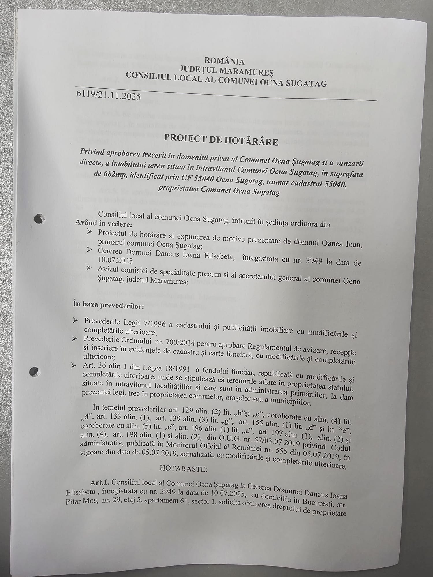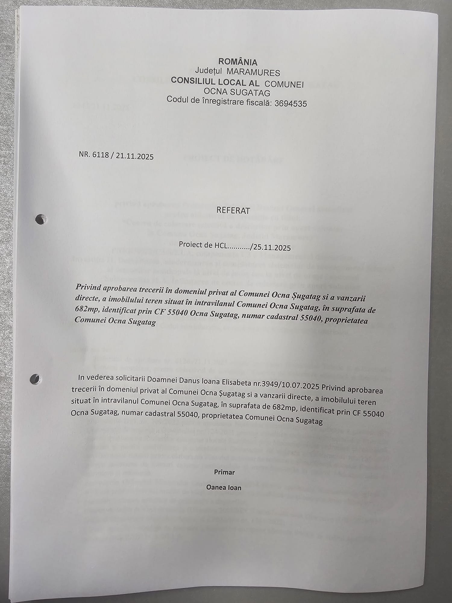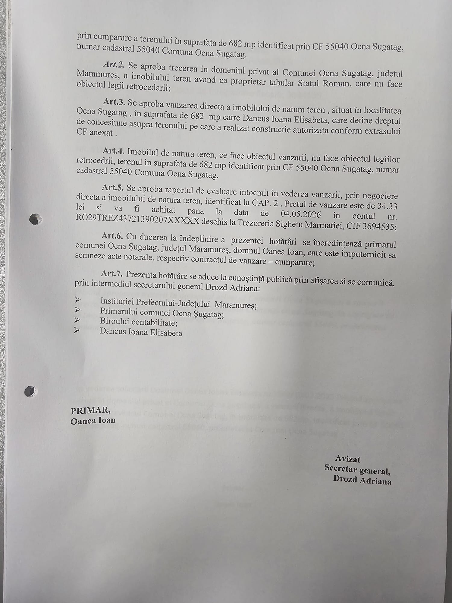Privind aprobarea trecerii în domeniul privat al Comunei Ocna Șugatag și a vânzării directe a imobilului – teren situat în intravilanul Comunei Ocna Șugatag, în suprafață de 682 mp, identificat prin CF 55040 Ocna Șugatag, număr cadastral 55040, proprietatea Comunei Ocna Șugatag.